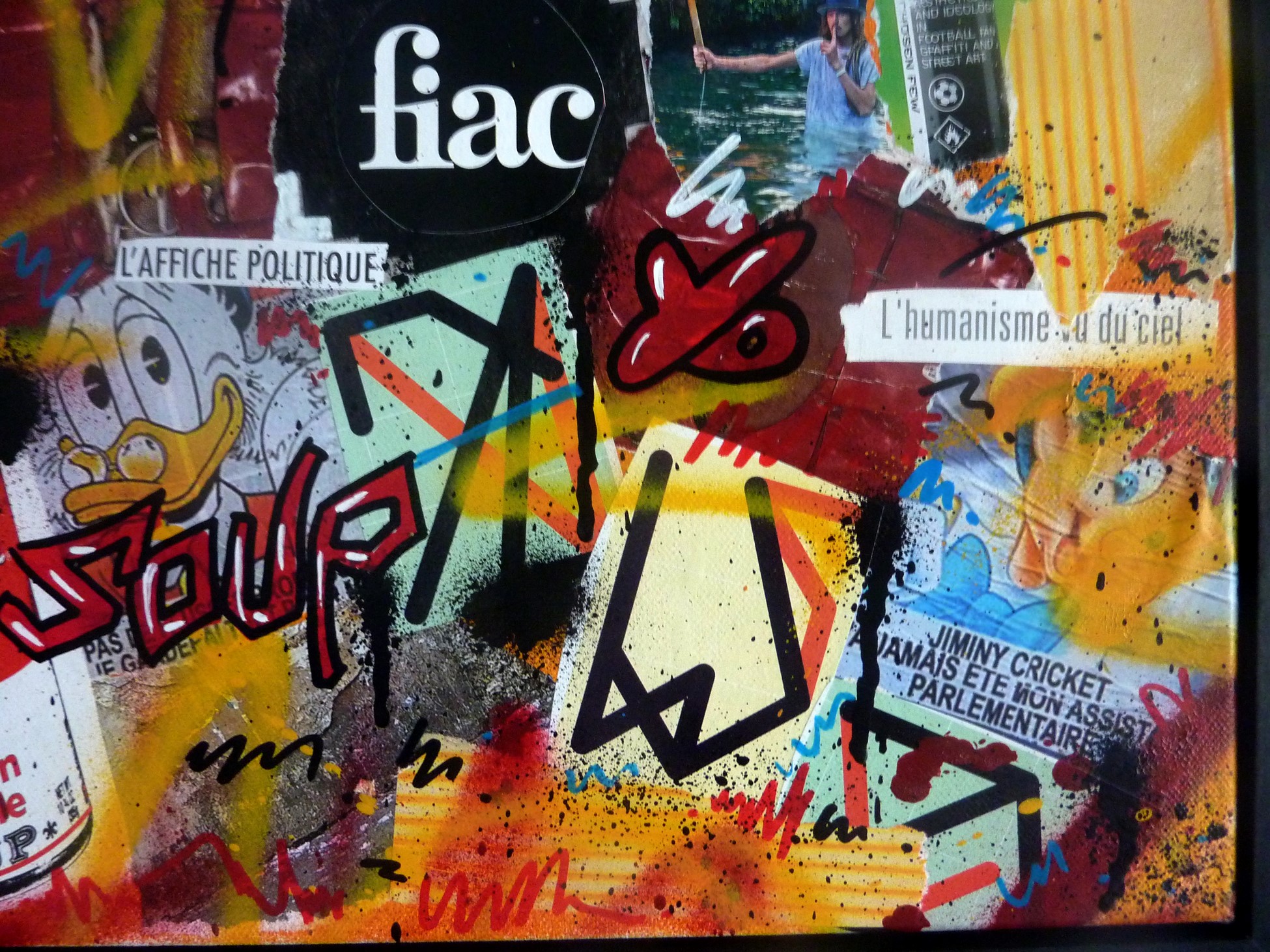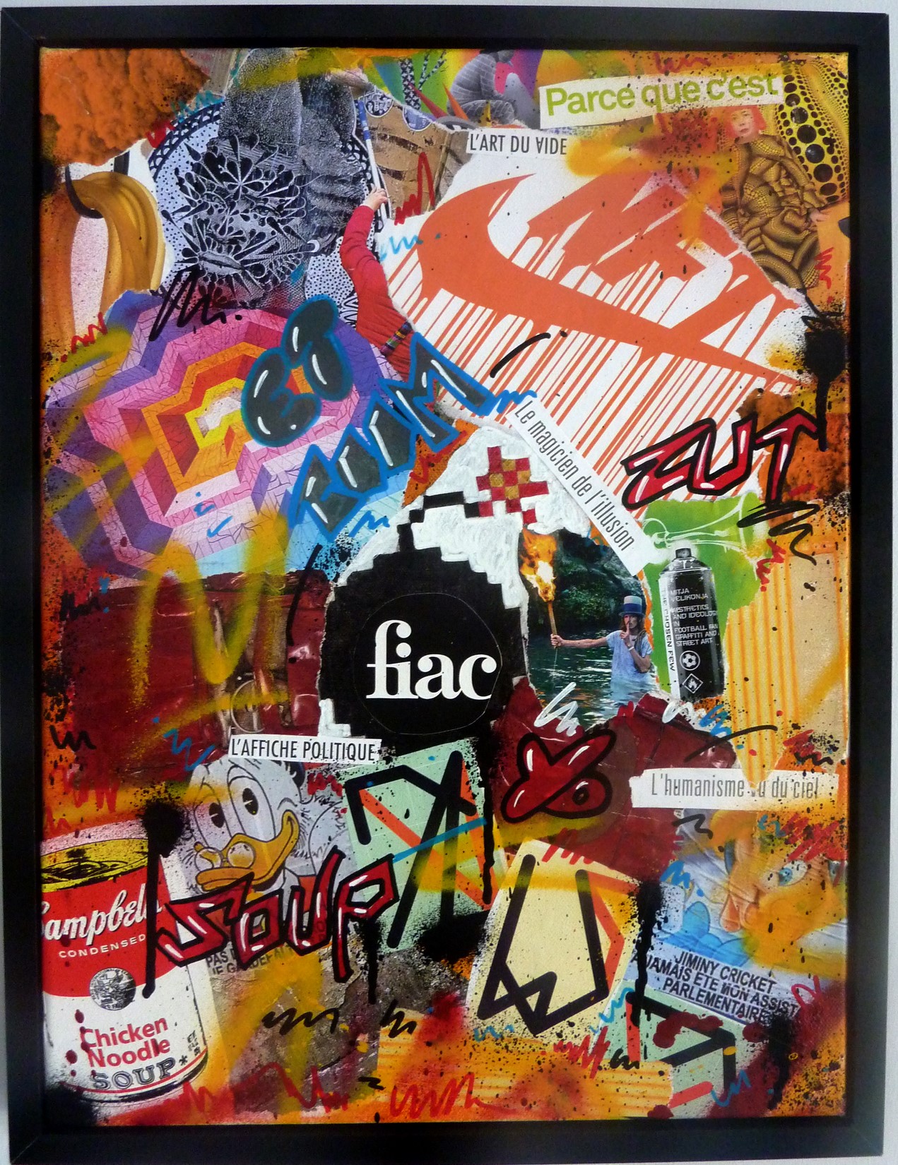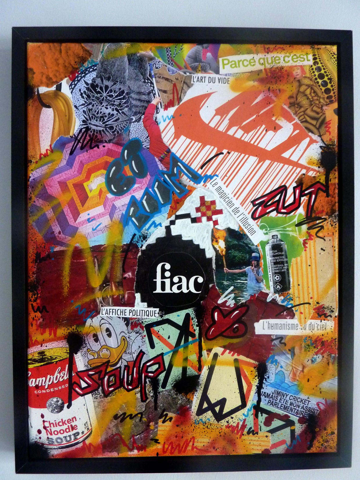 Collage, spray et acrylique sur toile montée sur châssis + caisse américaine