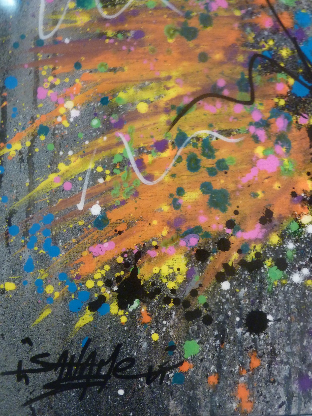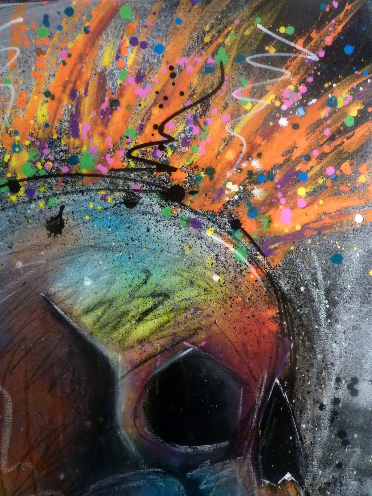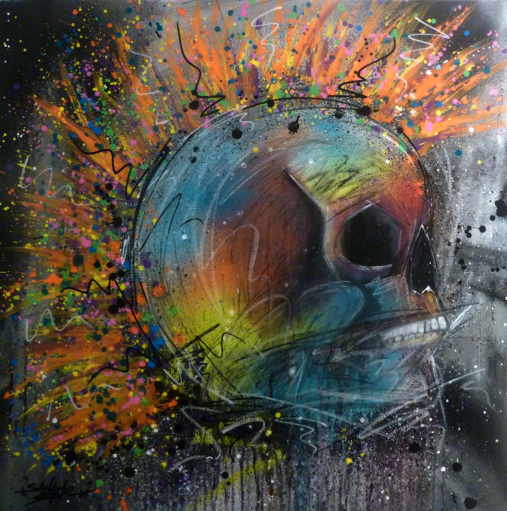 Spray, acrylique et pastels sur toile montée sur châssis recouvert de résine