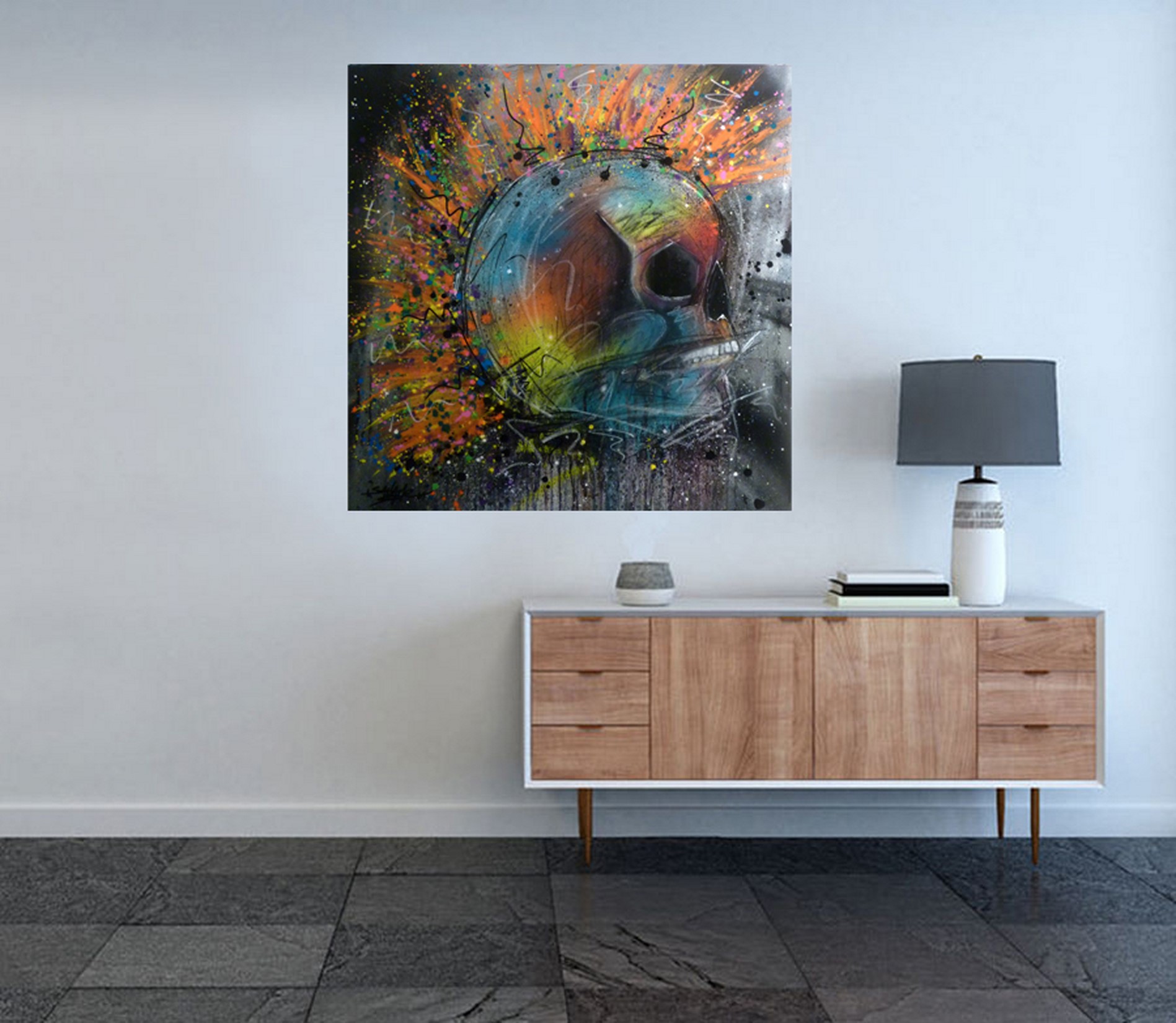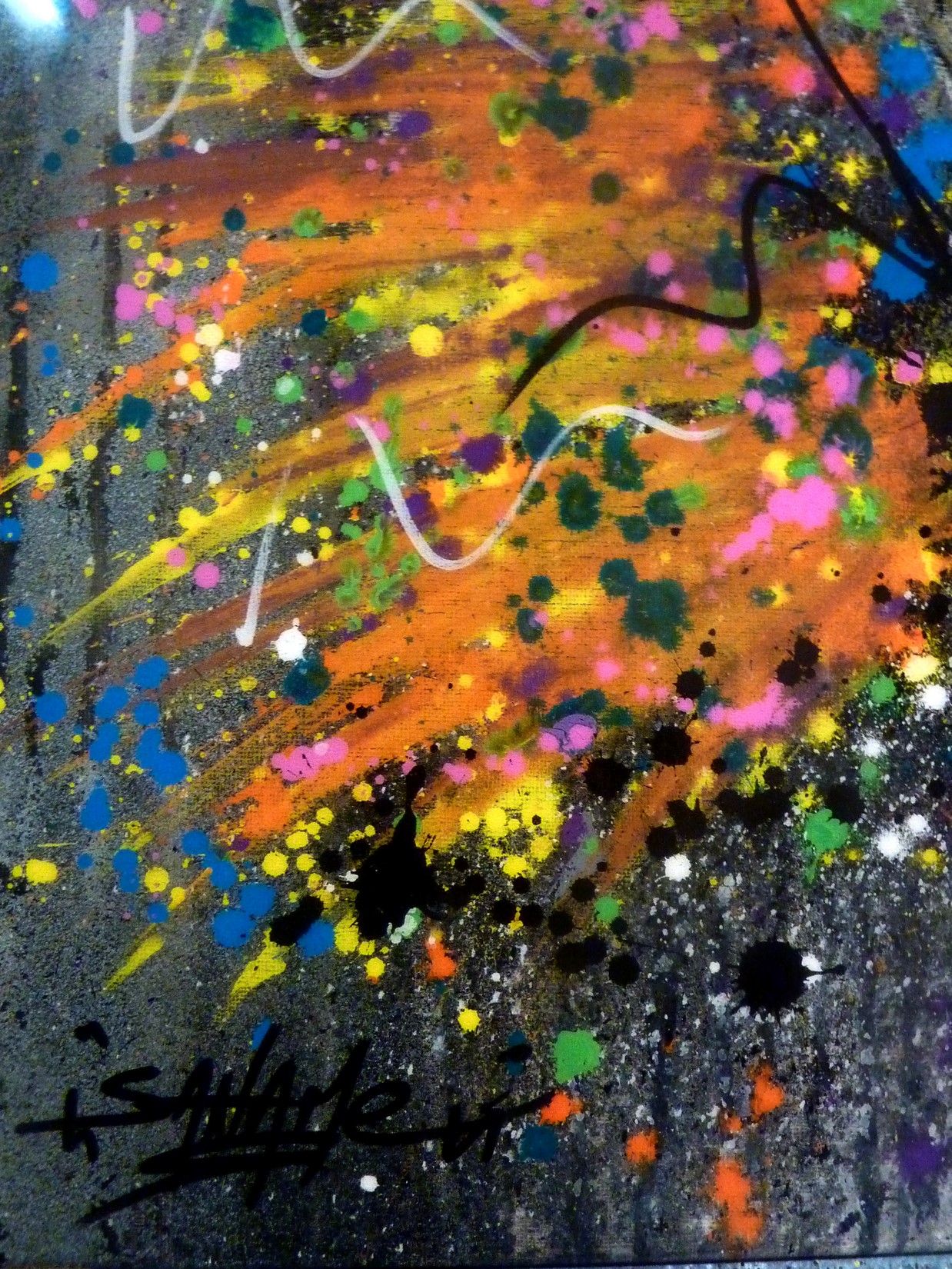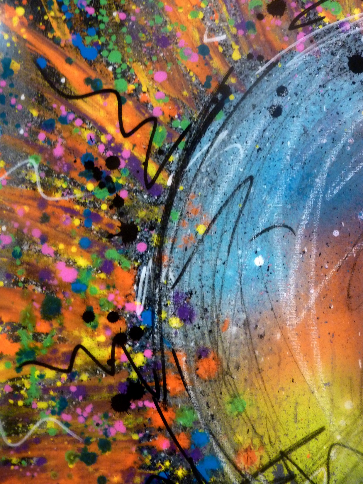 Spray, acrylique et pastels sur toile montée sur châssis recouvert de résine