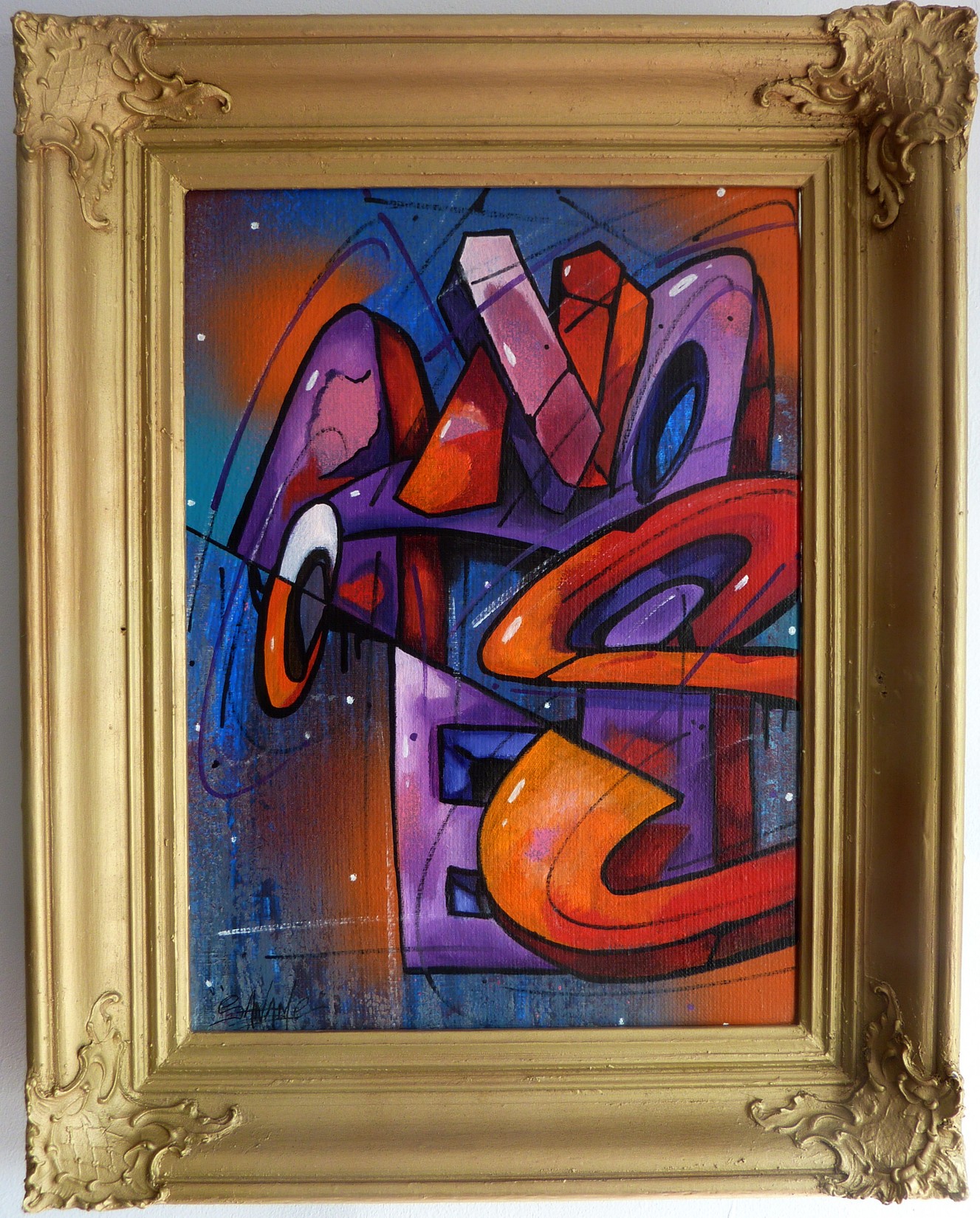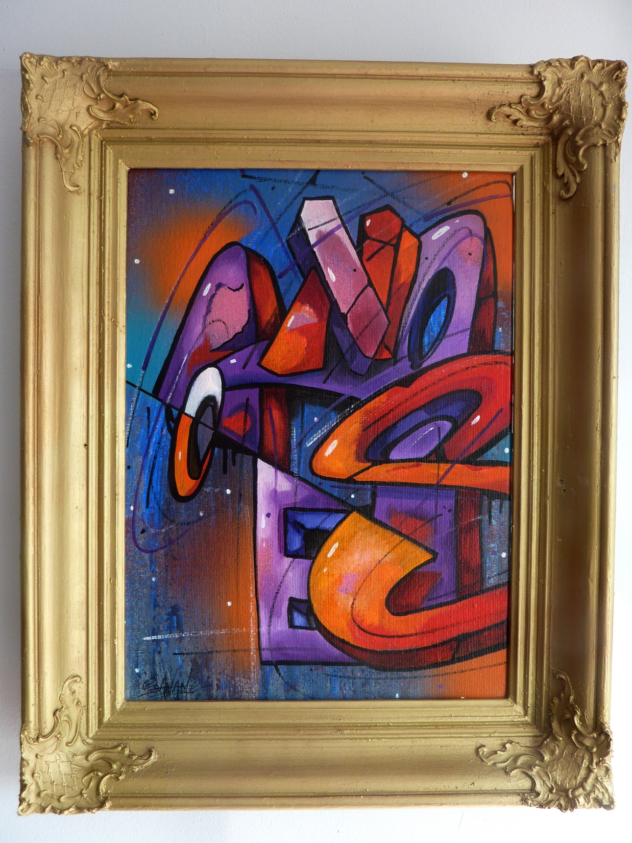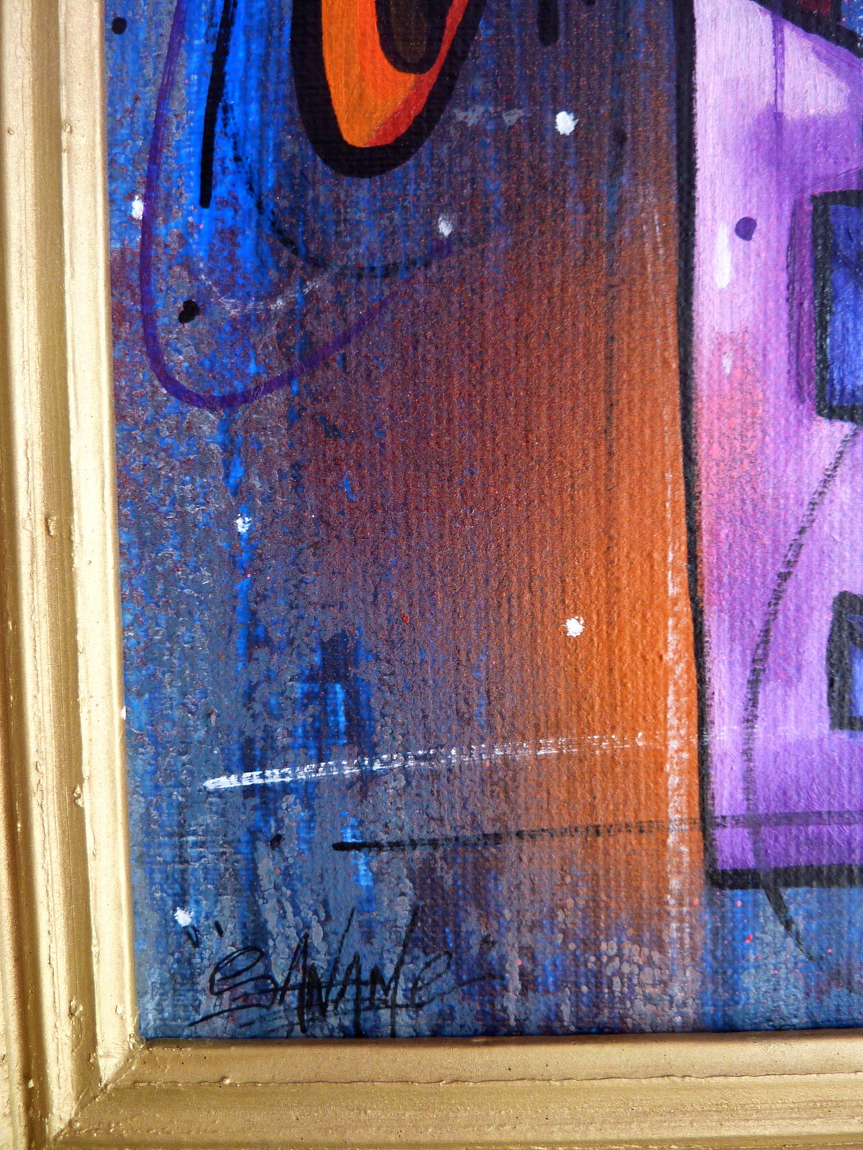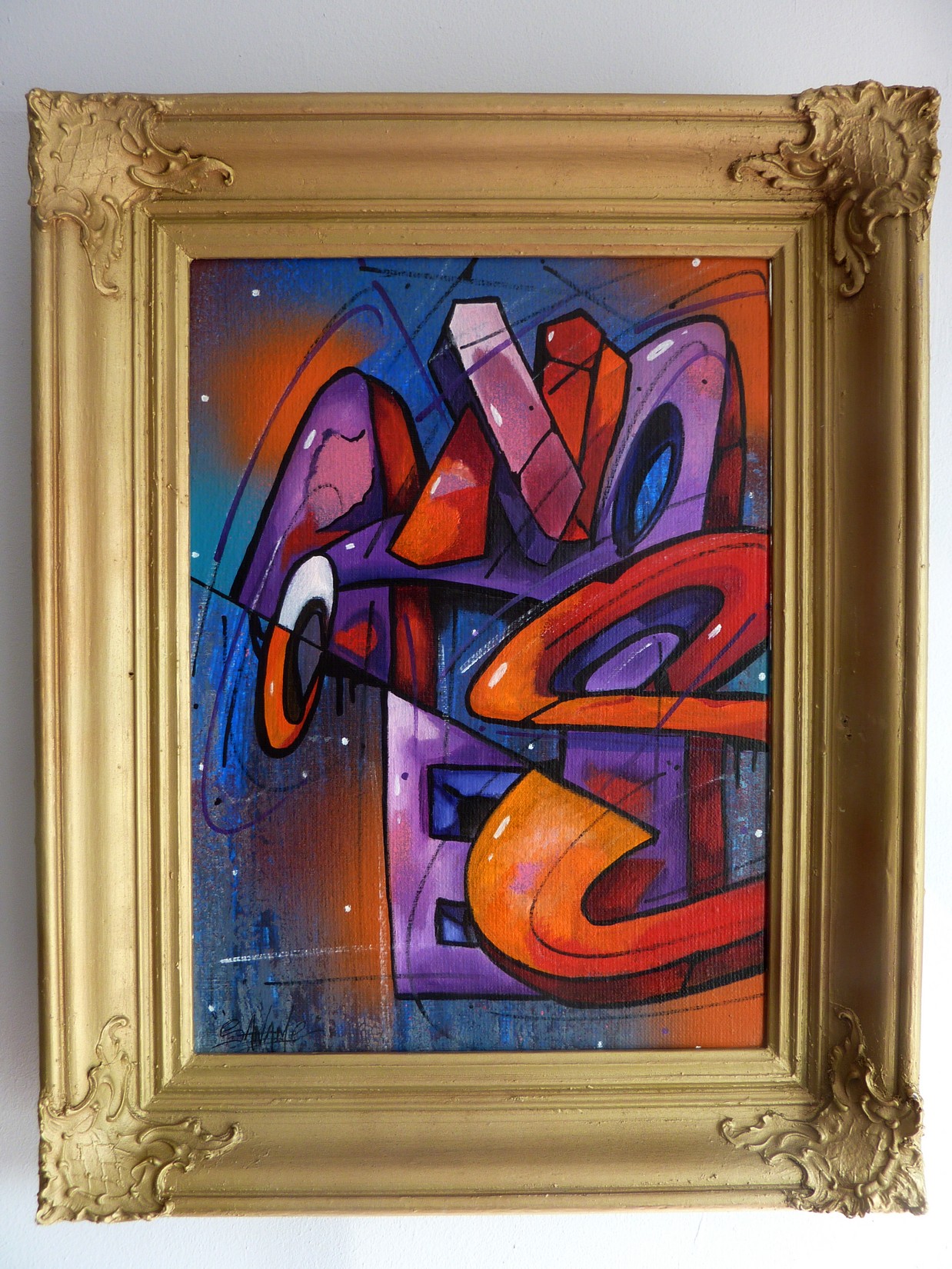 Acrylique, spray et huile sur toile montée sur châssis, avec cadre ancien doré.