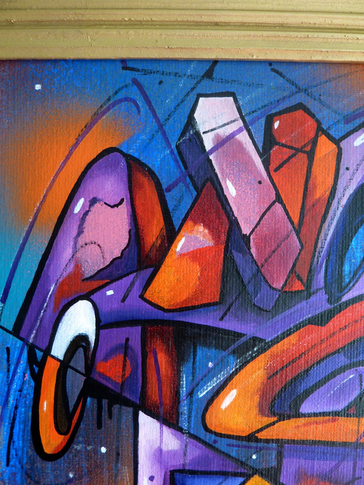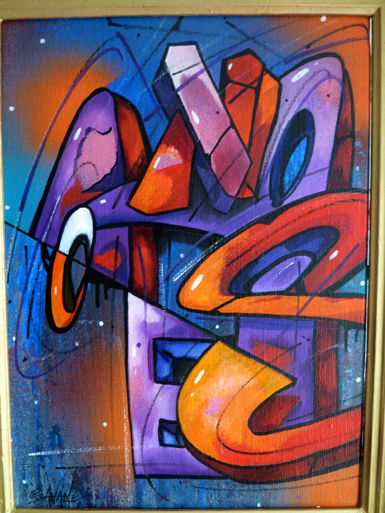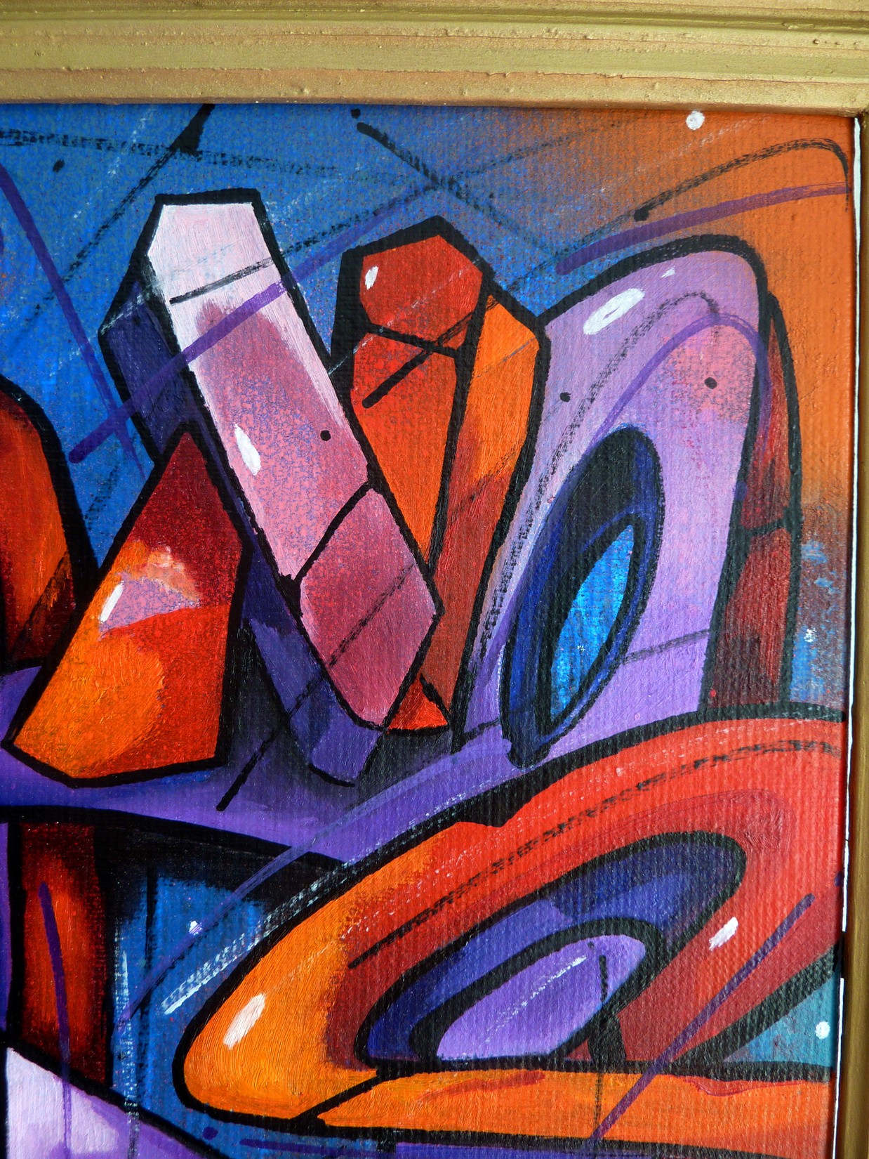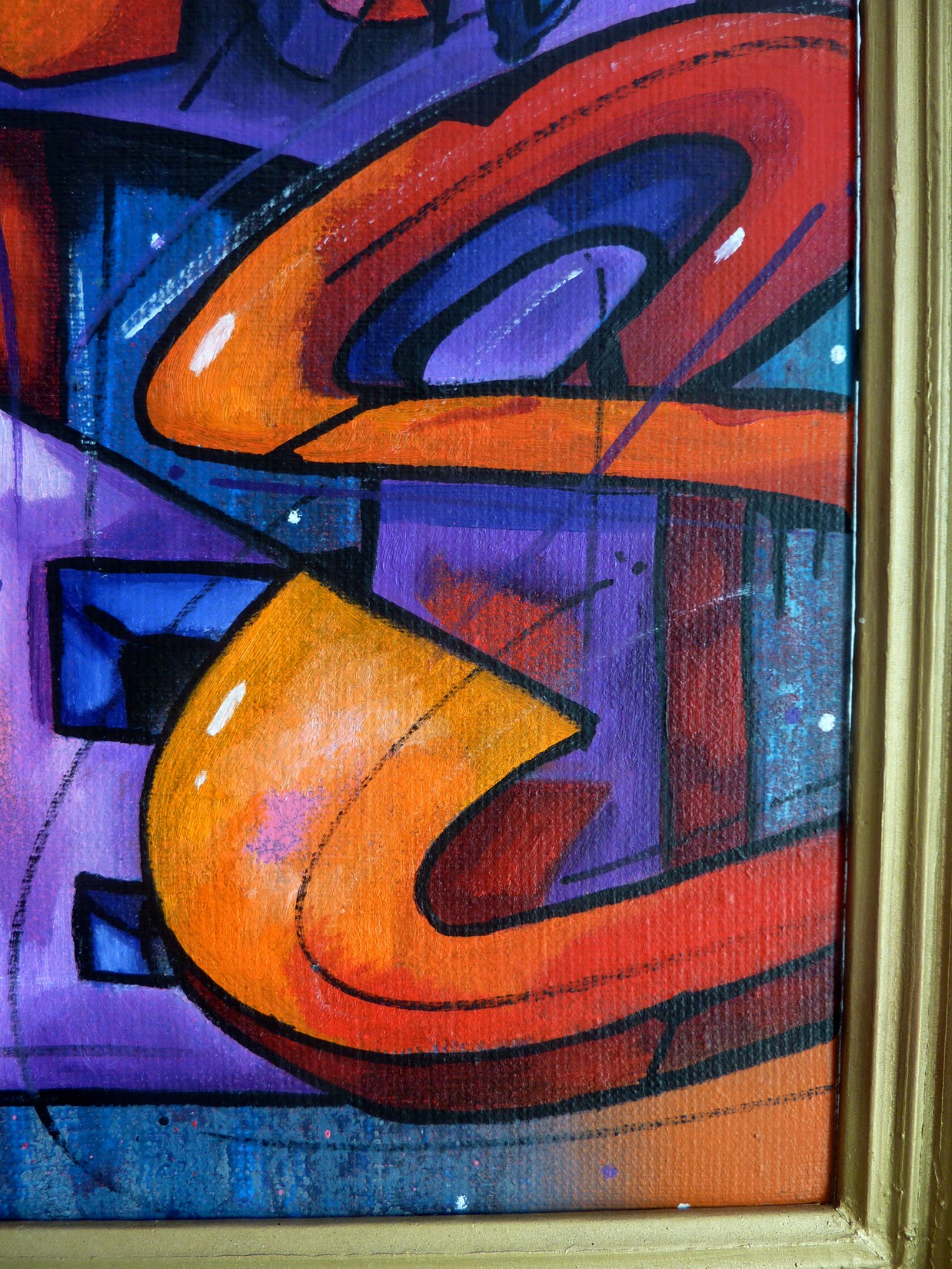 Acrylique, spray et huile sur toile montée sur châssis, avec cadre ancien doré.