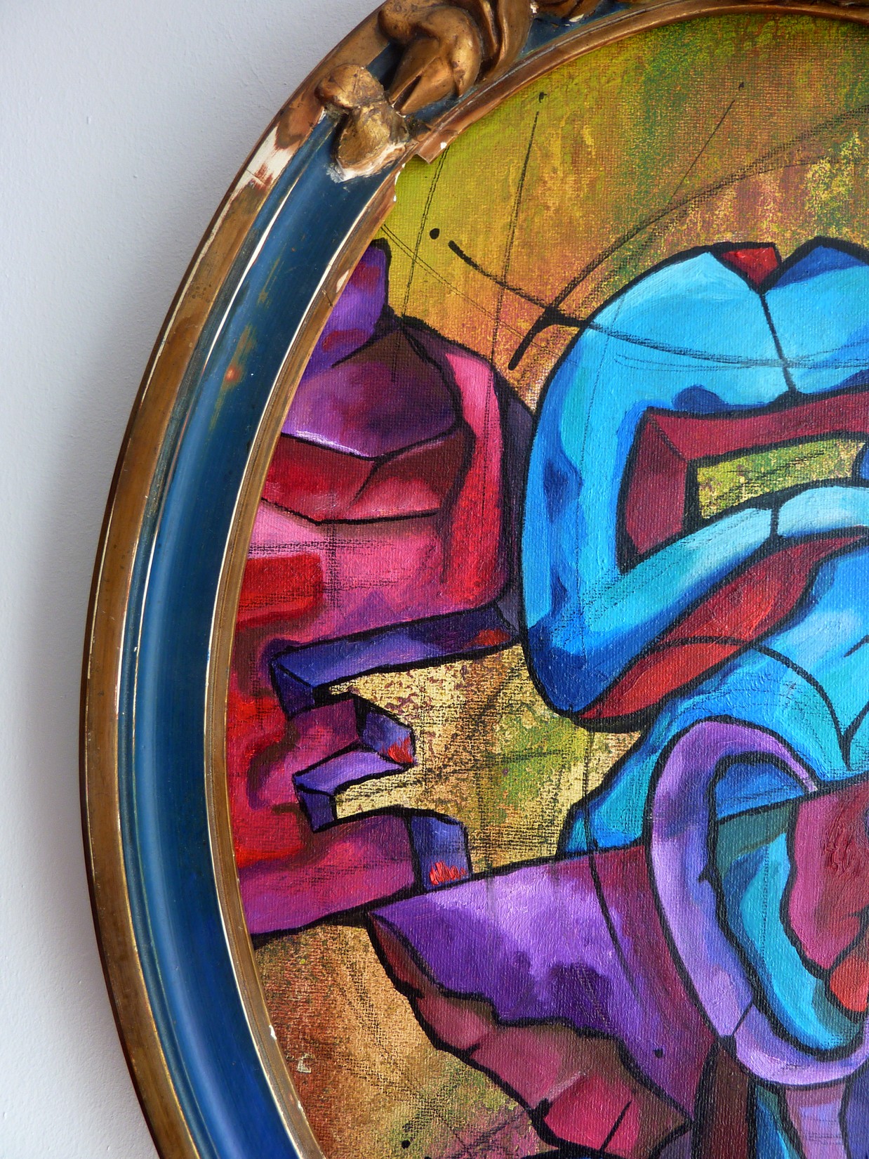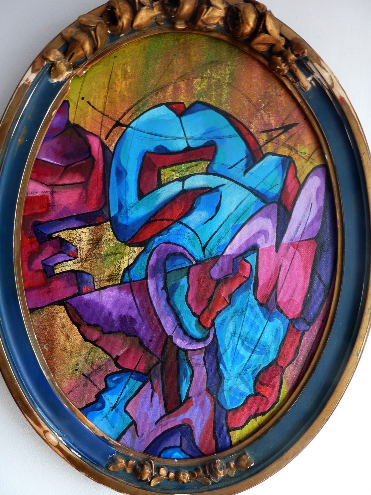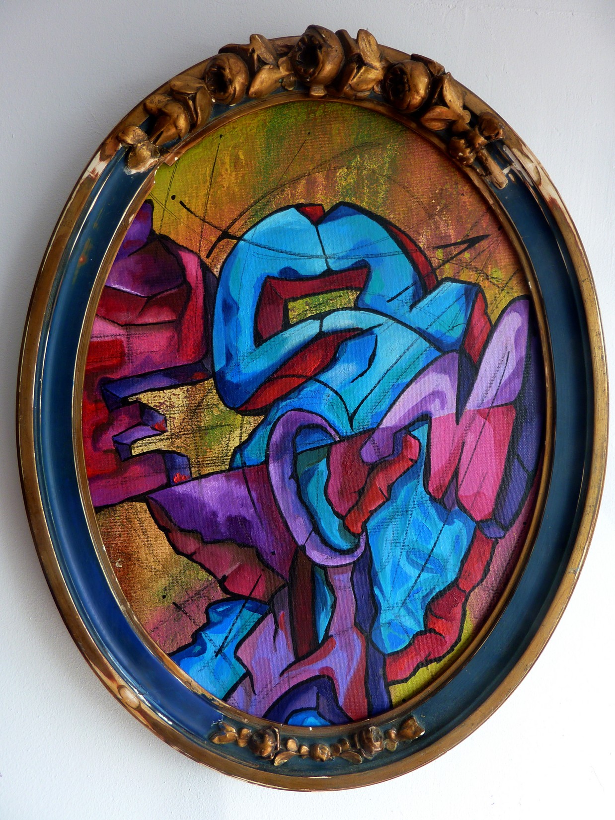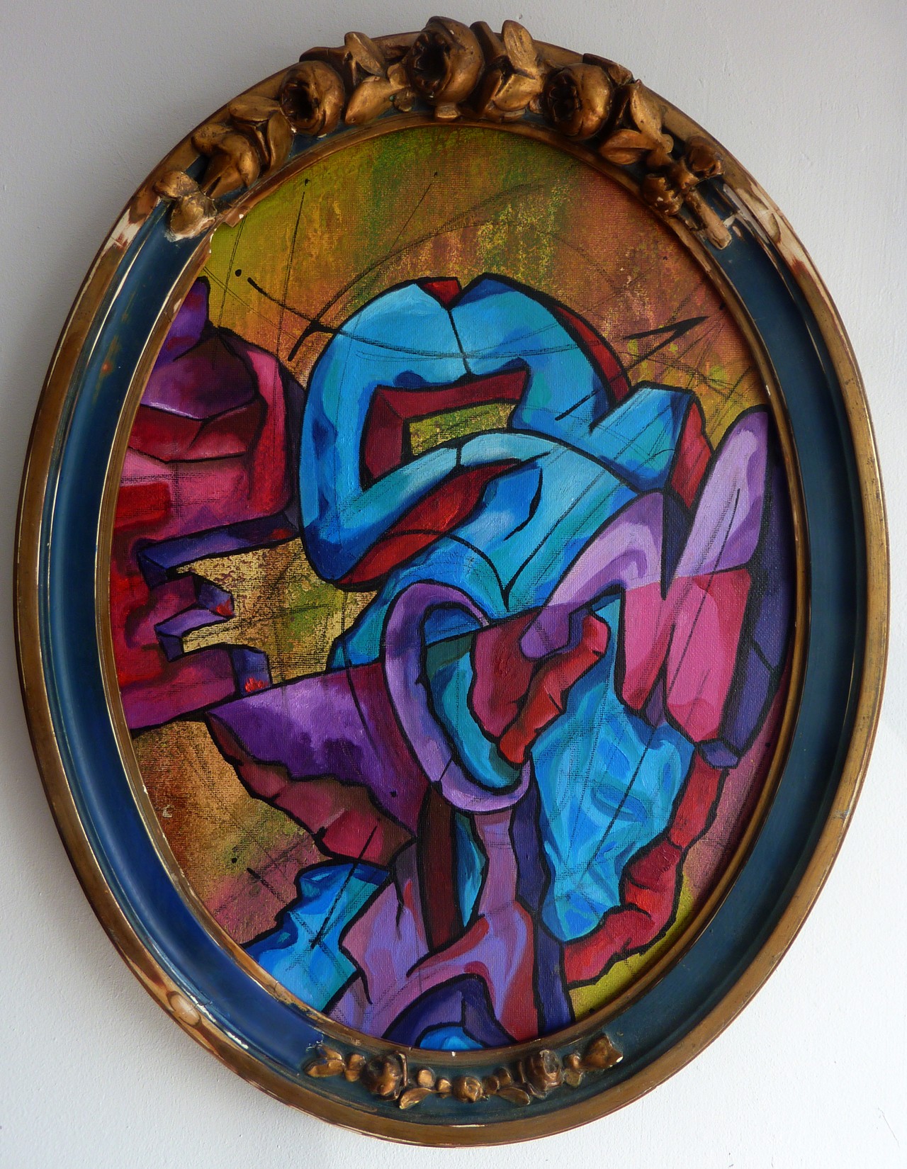 Acrylique, spray et huile sur toile montée sur châssis, avec cadre ancien.