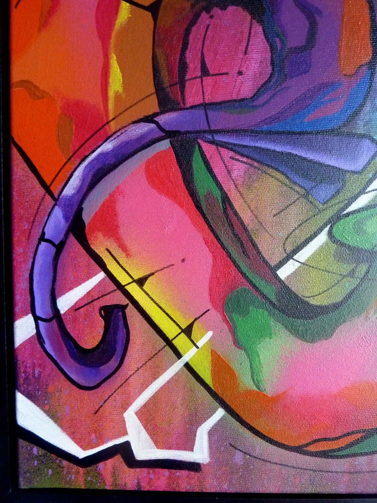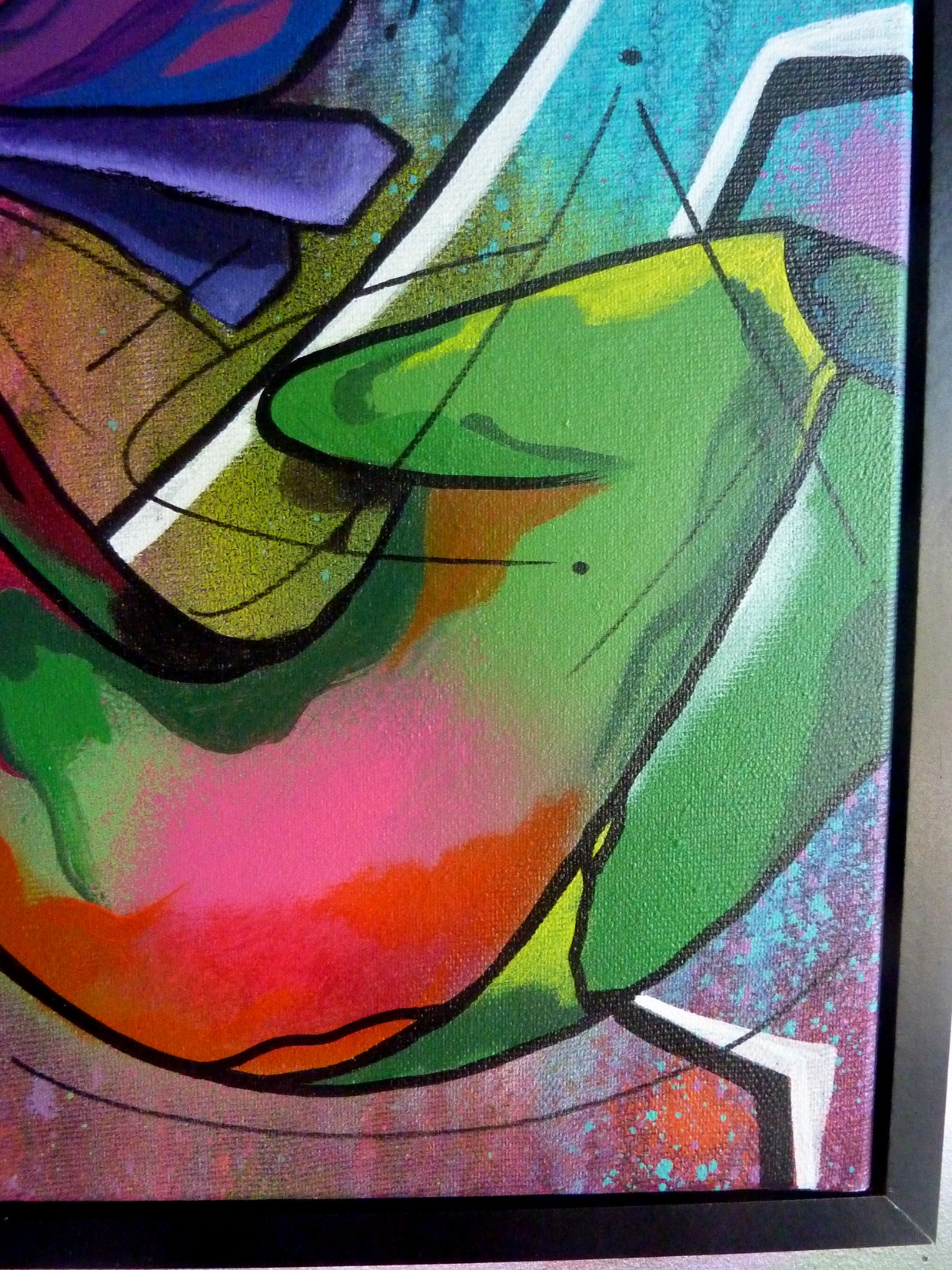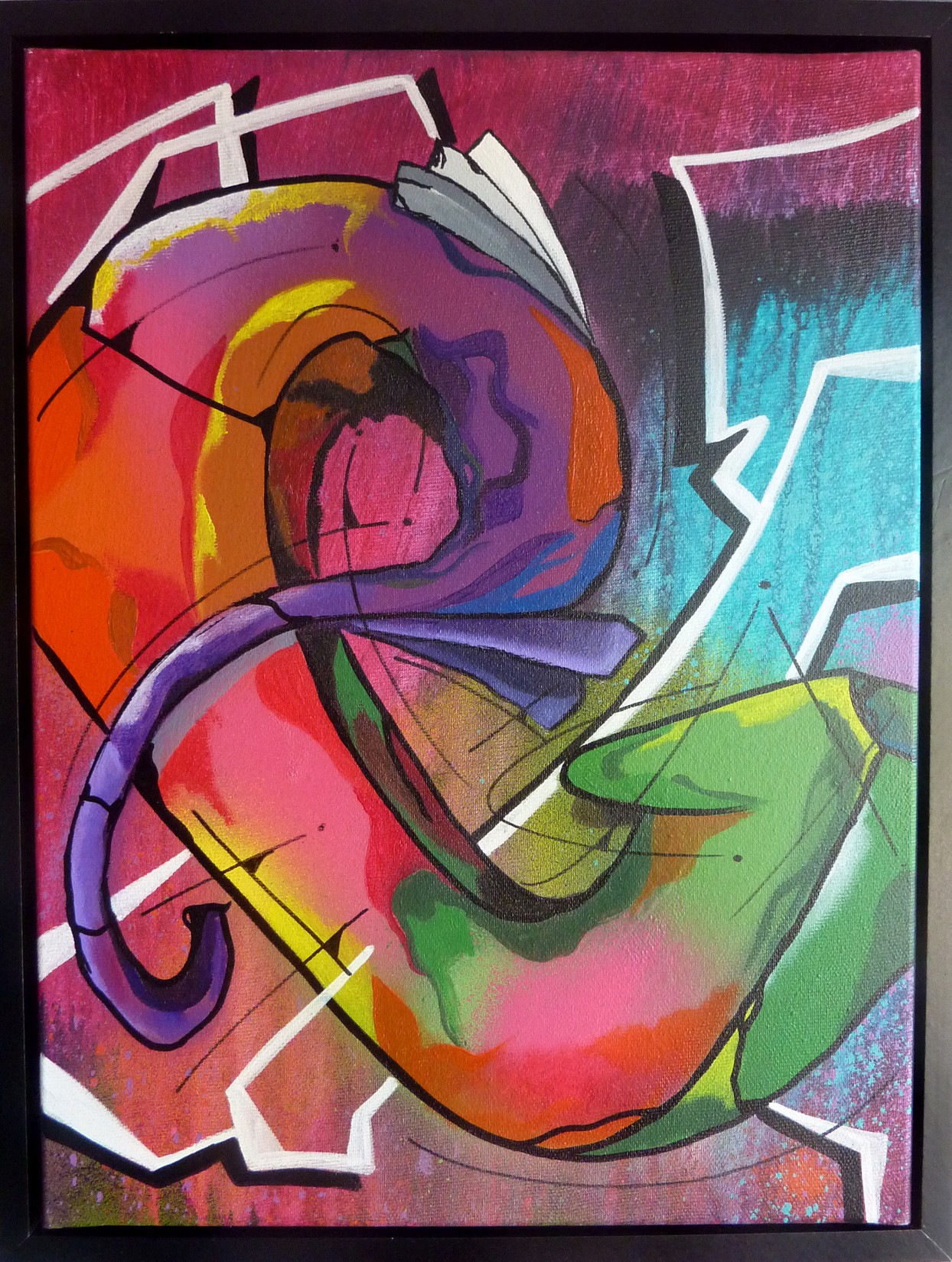 Acrylique et spray sur toile montée sur châssis, avec cadre caisse américaine noir.