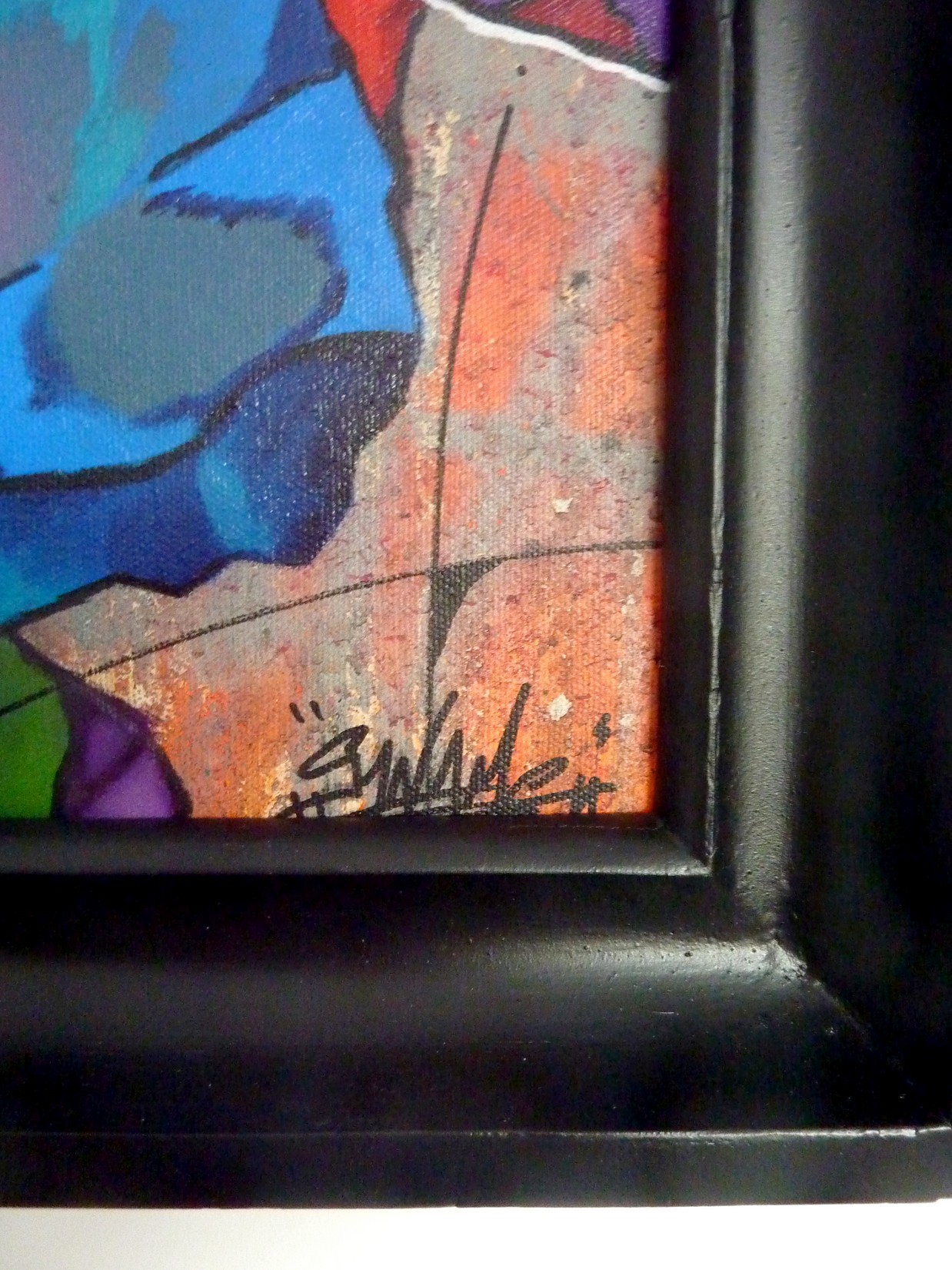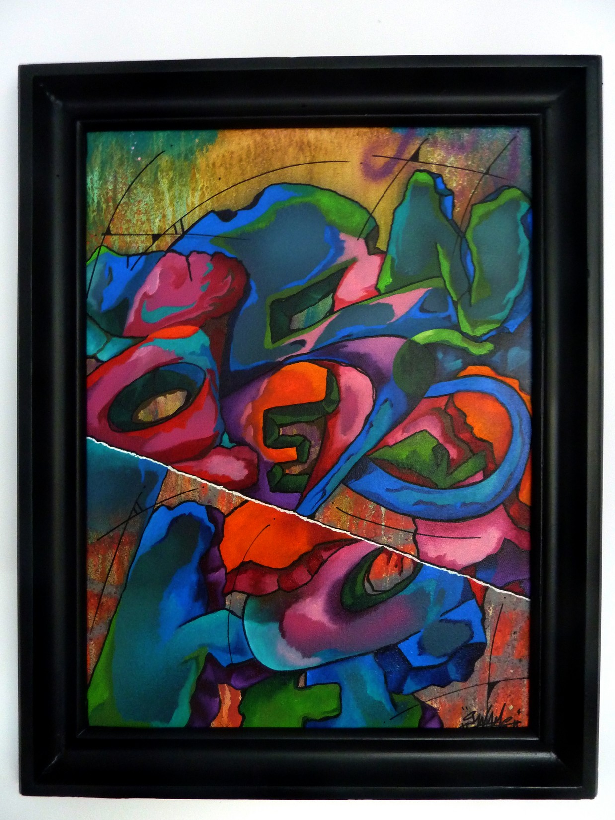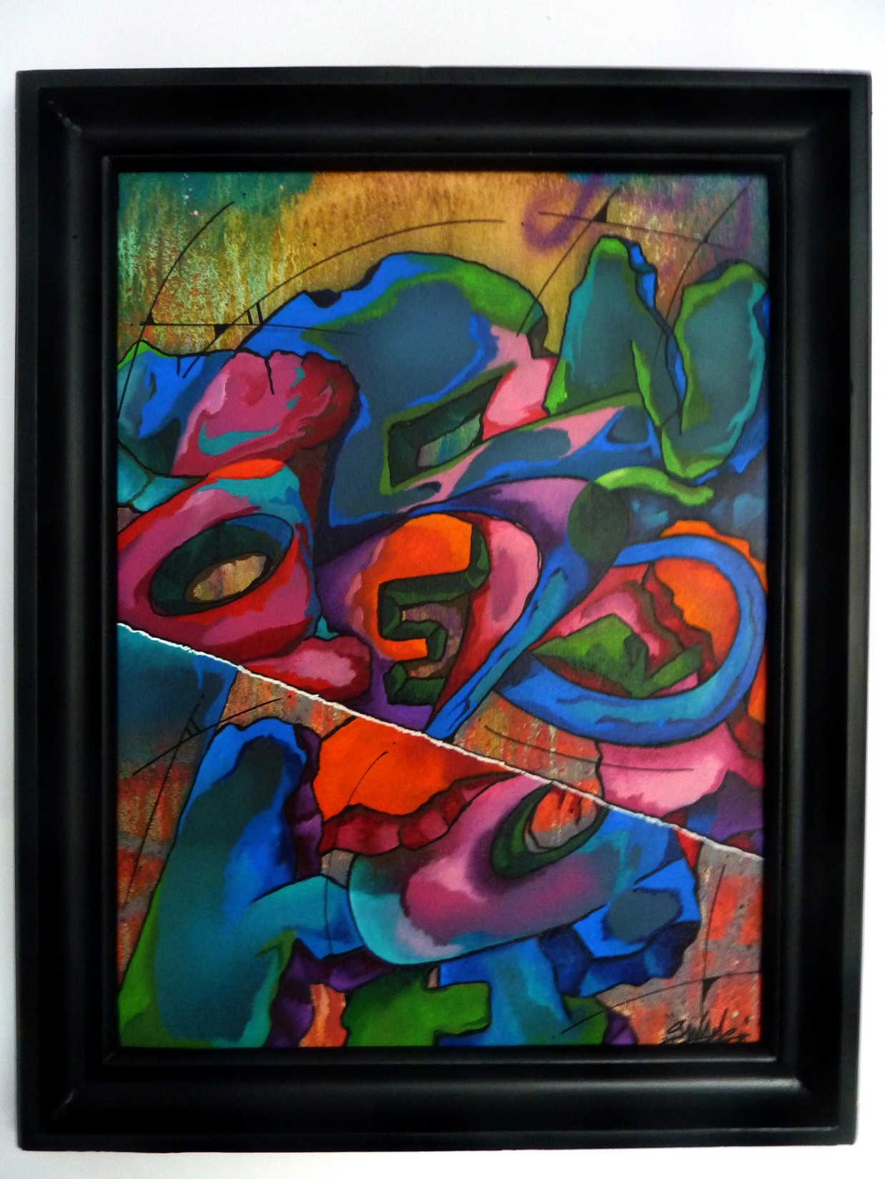 Acrylique, spray et huile sur toile montée sur châssis, avec cadre 58×74.