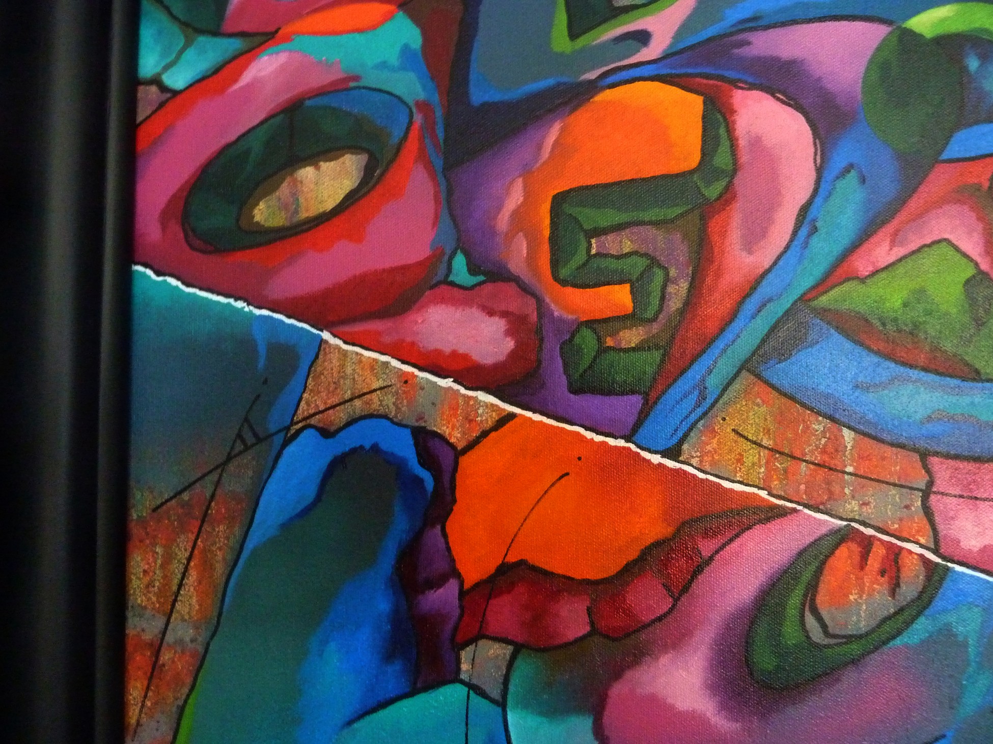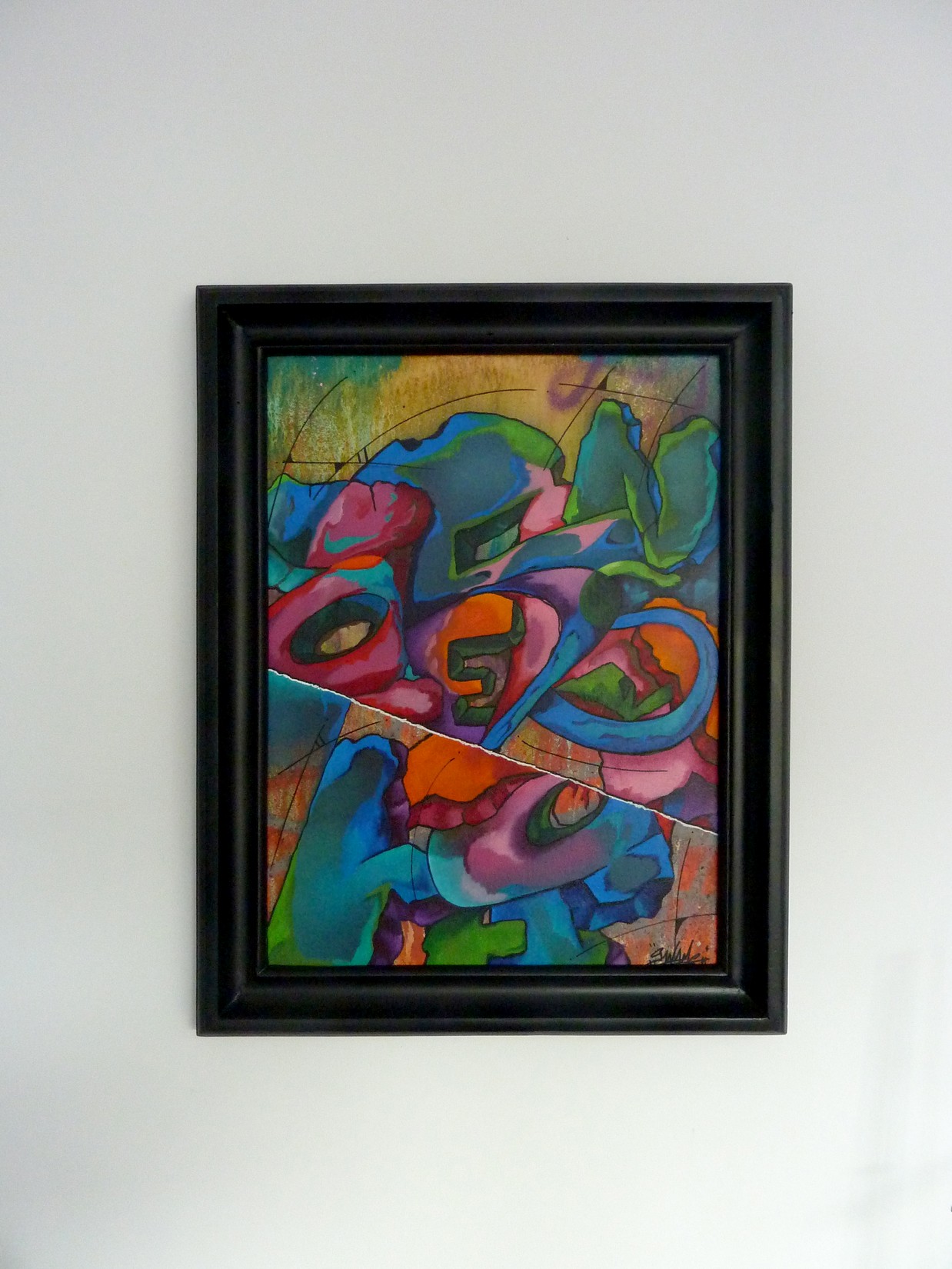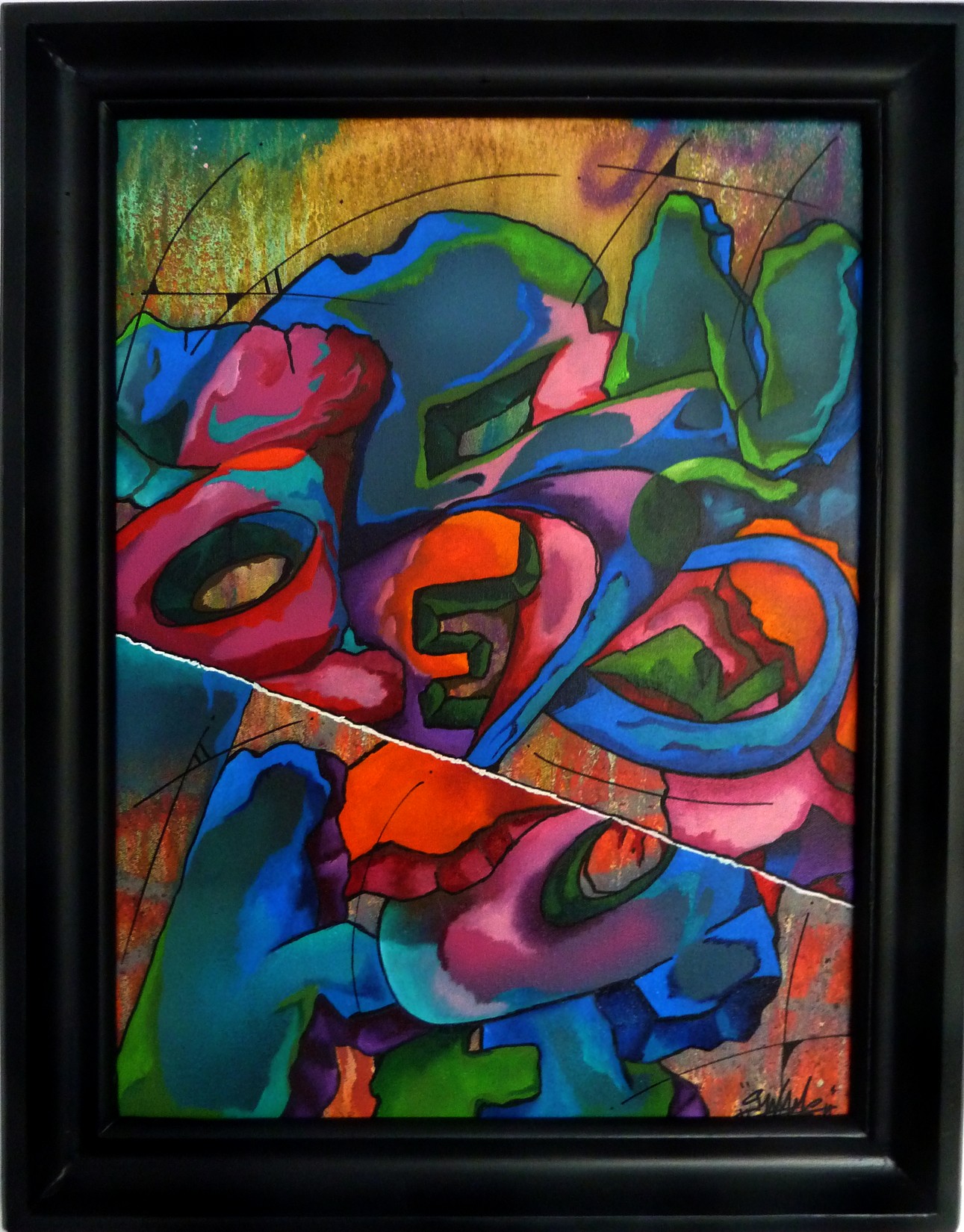 Acrylique, spray et huile sur toile montée sur châssis, avec cadre 58×74.
