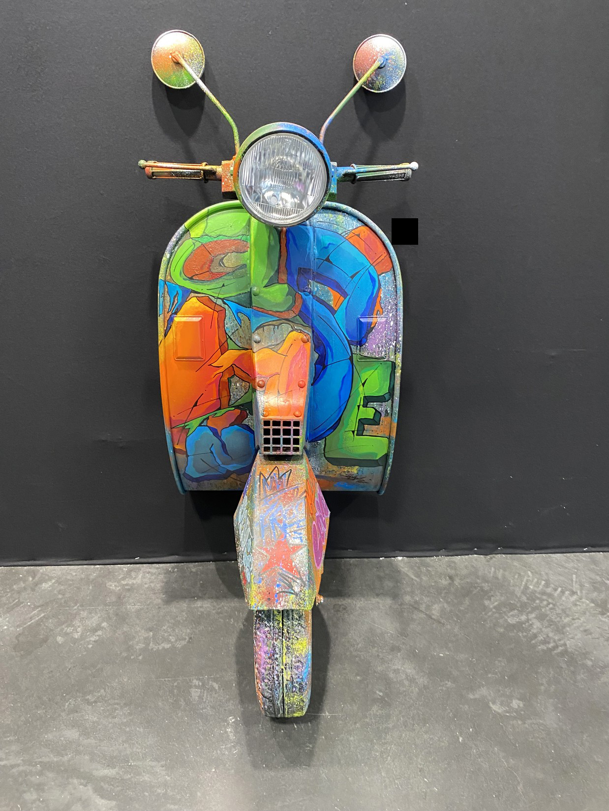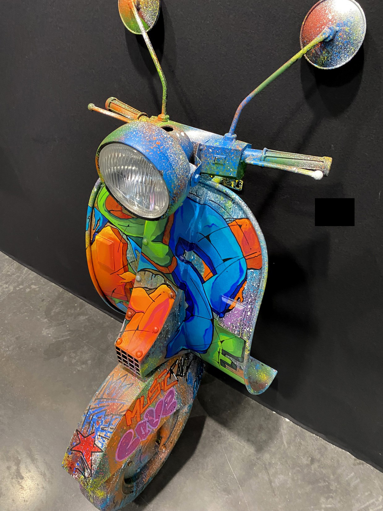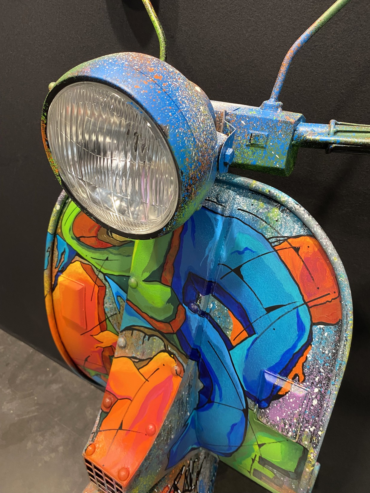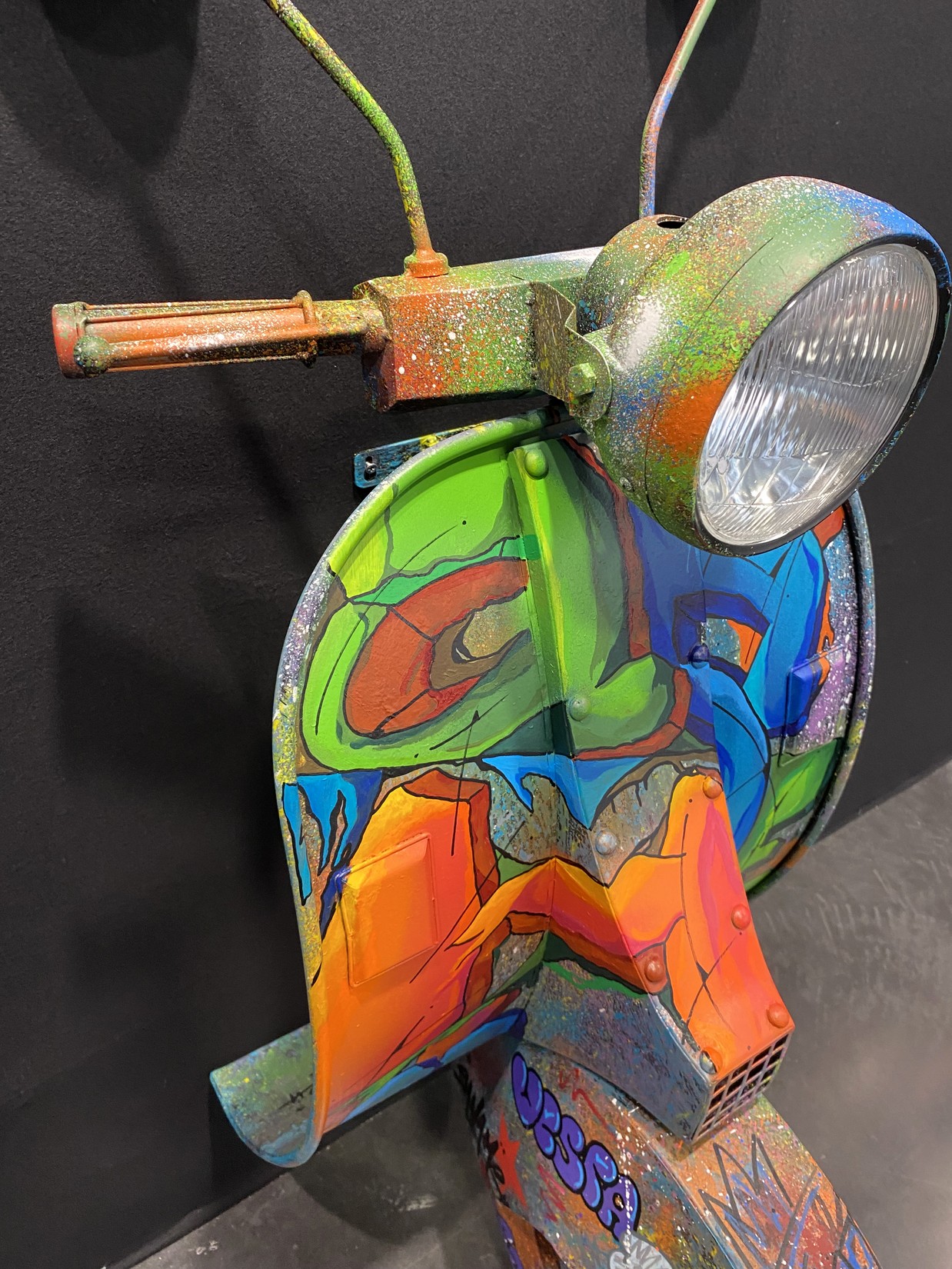 Acrylique, spray et huile sur vespa décoratif métallique.