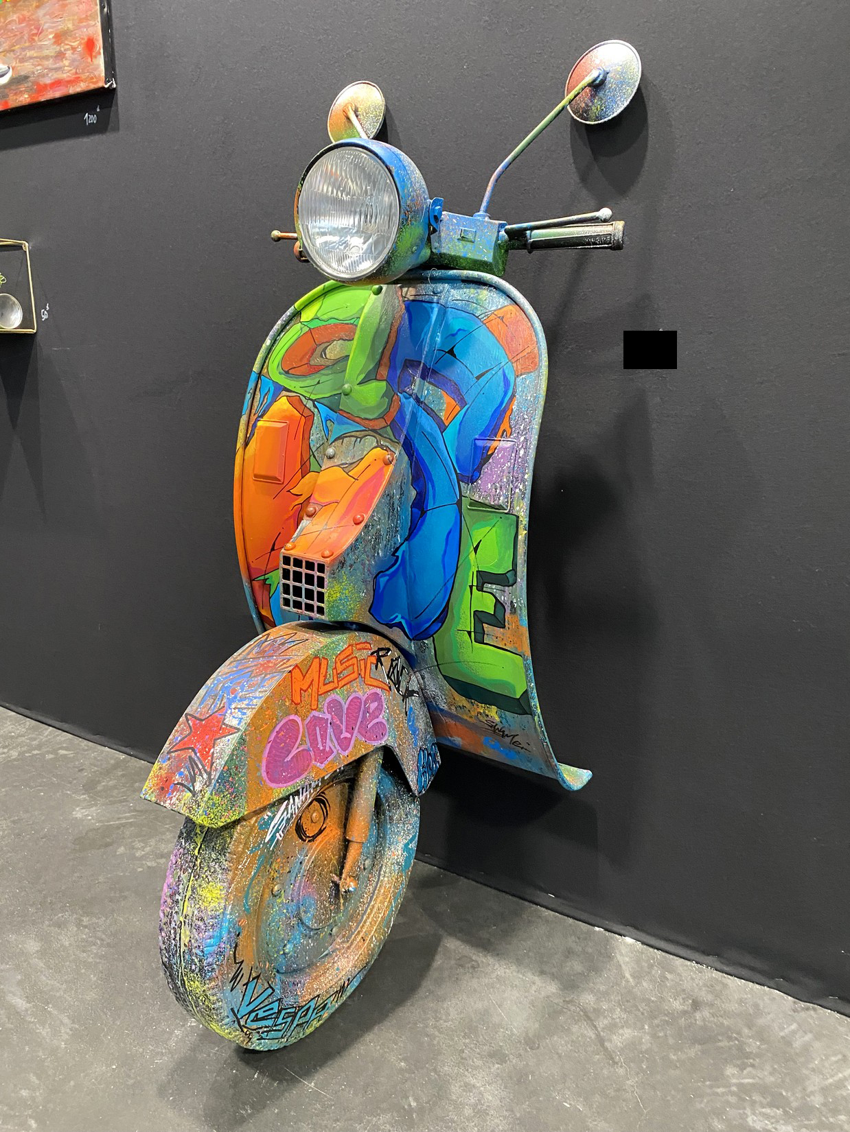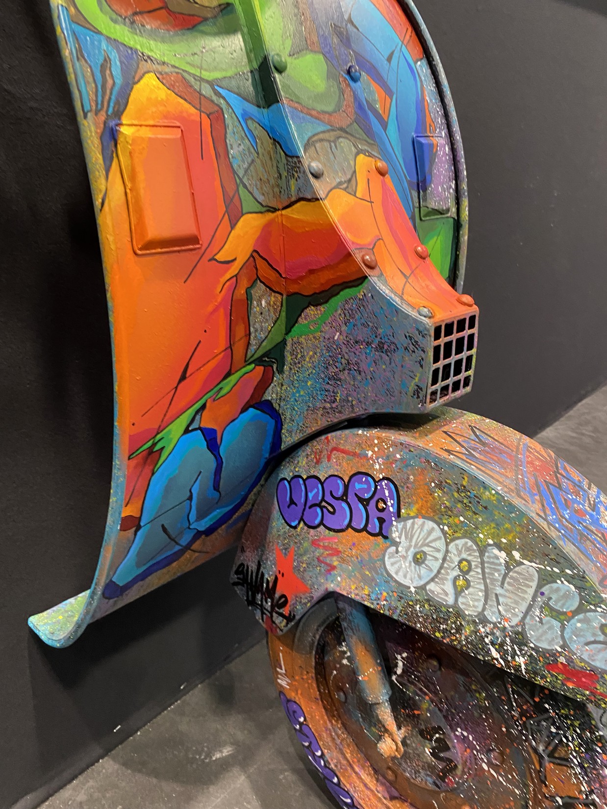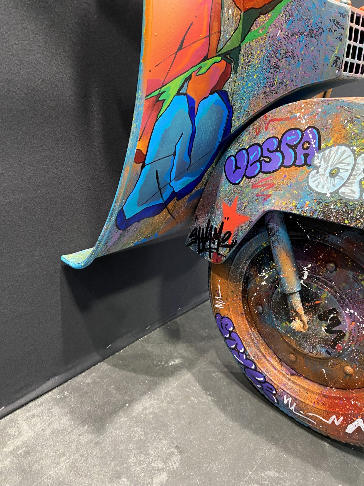 Acrylique, spray et huile sur vespa décoratif métallique.