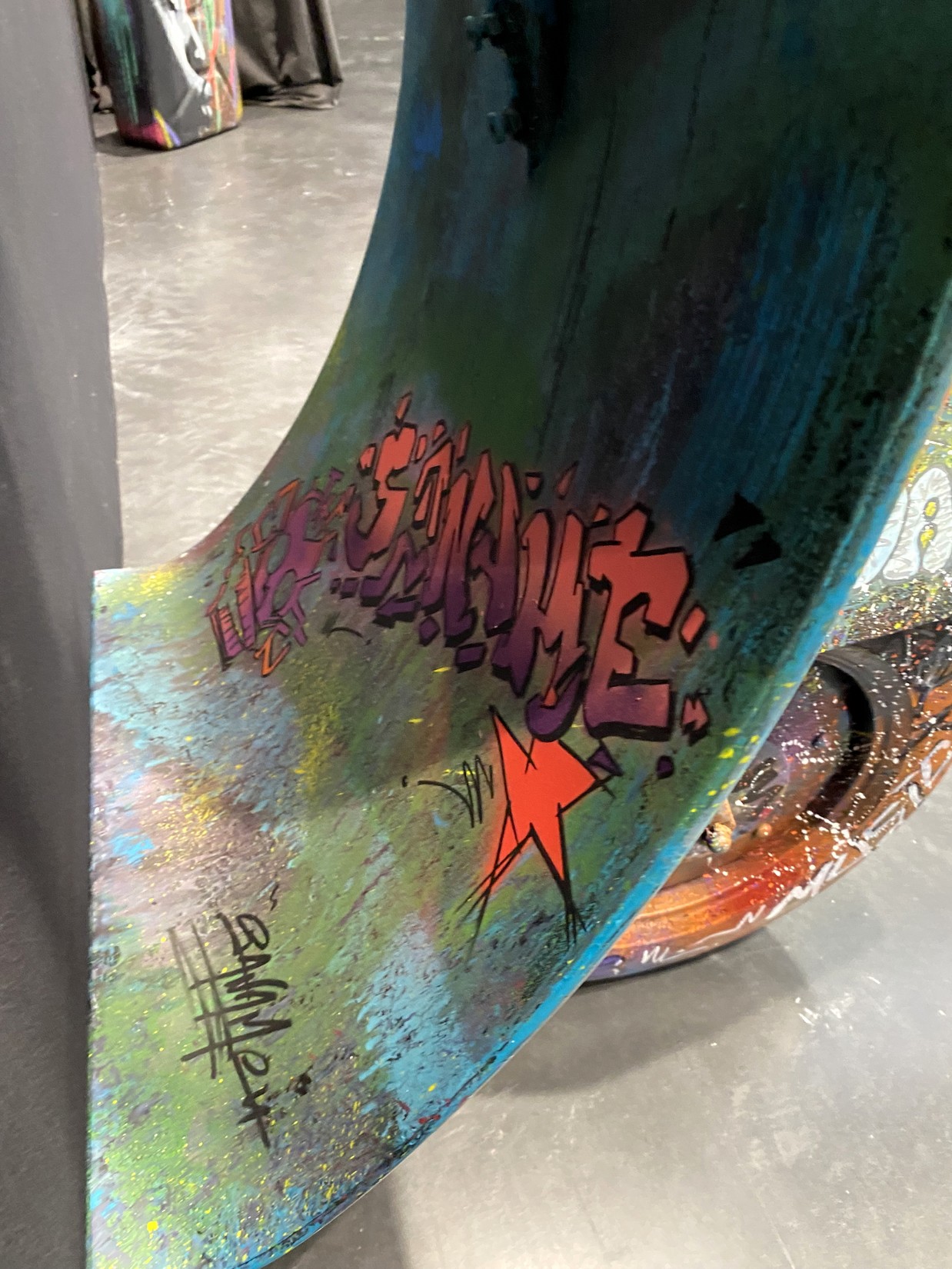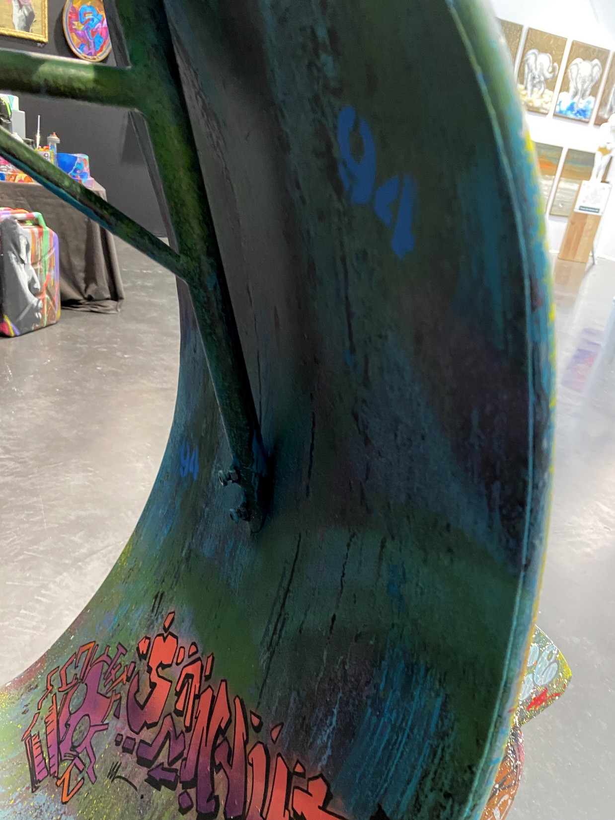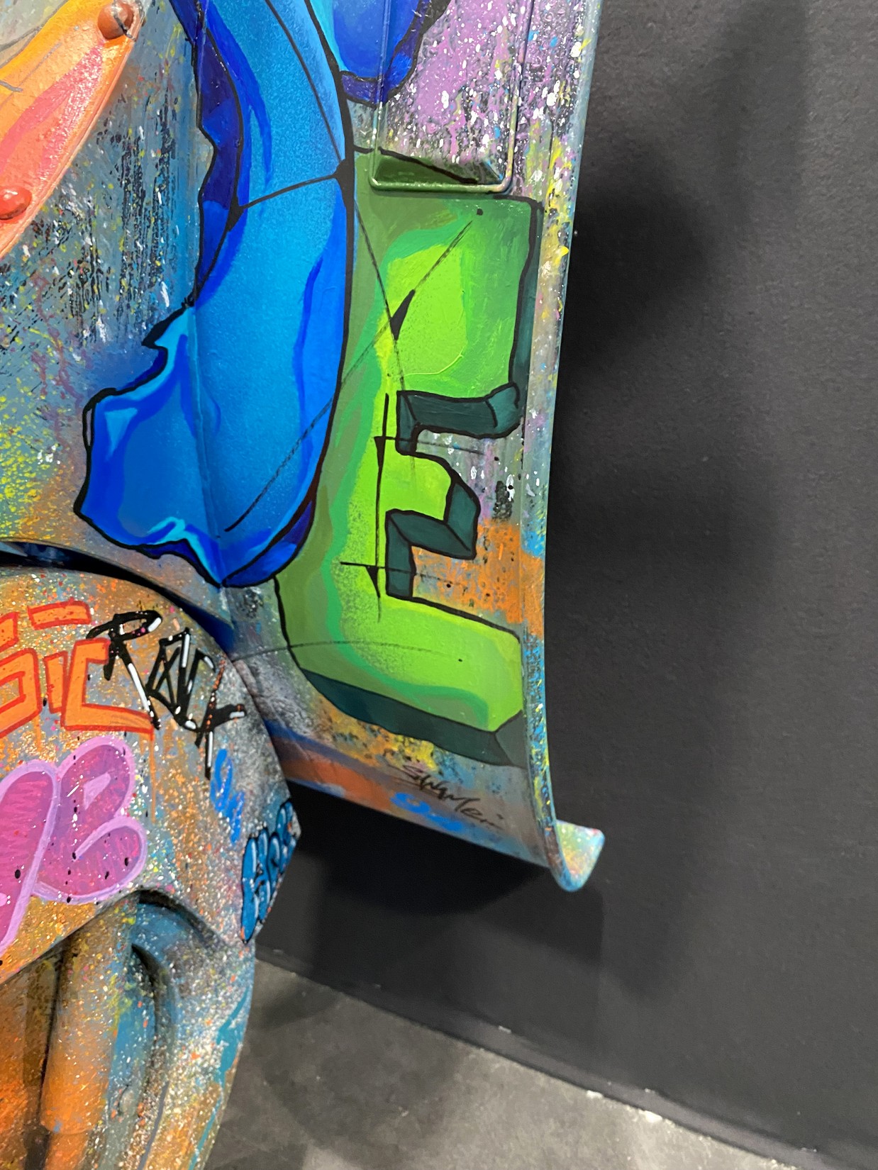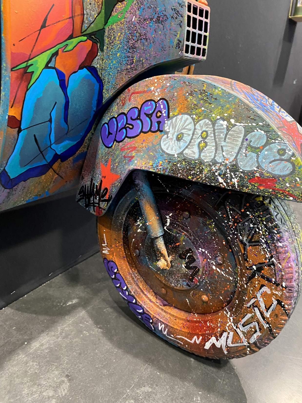 Acrylique, spray et huile sur vespa décoratif métallique.